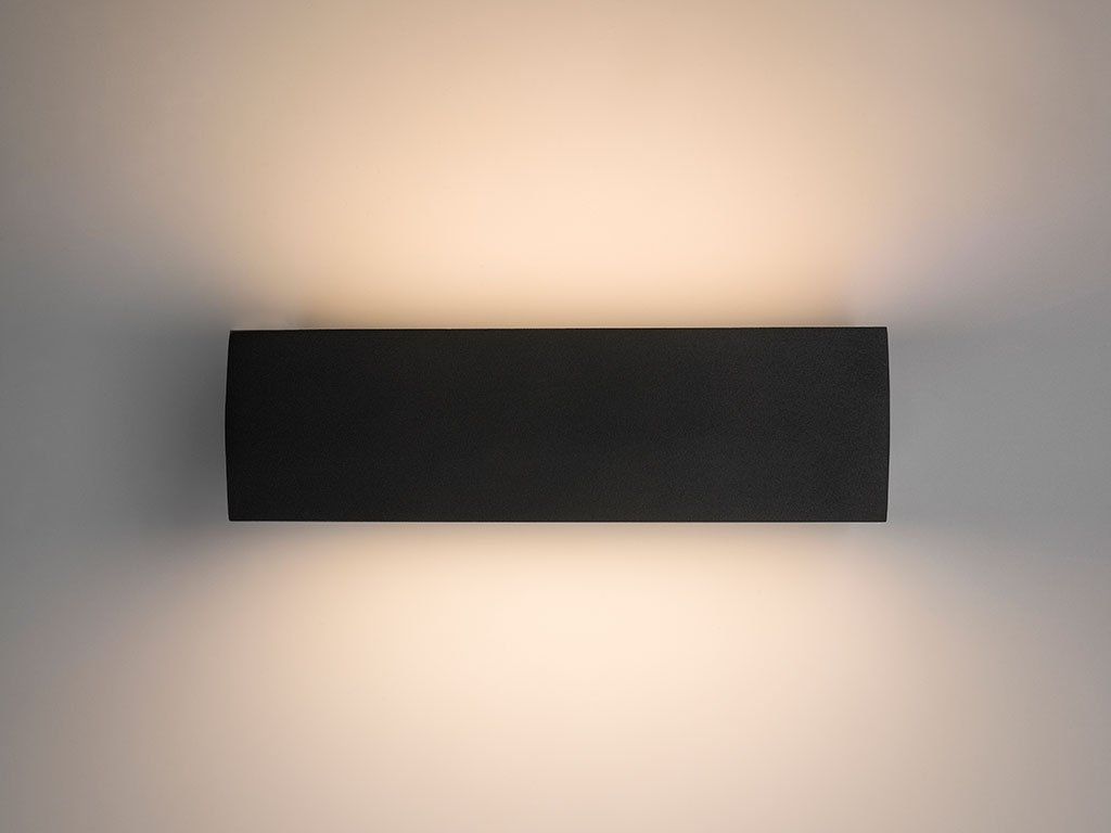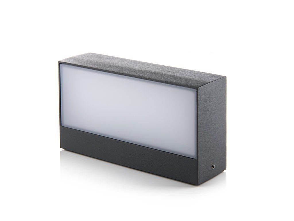 Hliníkové tělo s opálovým PMMA difuzérem a krytím IP 54 zajišťuje spolehlivý provoz ve venkovním prostředí i vlhkých exteriérových podmínkách. Vyzařovací úhel 2×160° vytváří symetrický efekt up-down osvětlení na svislých plochách.