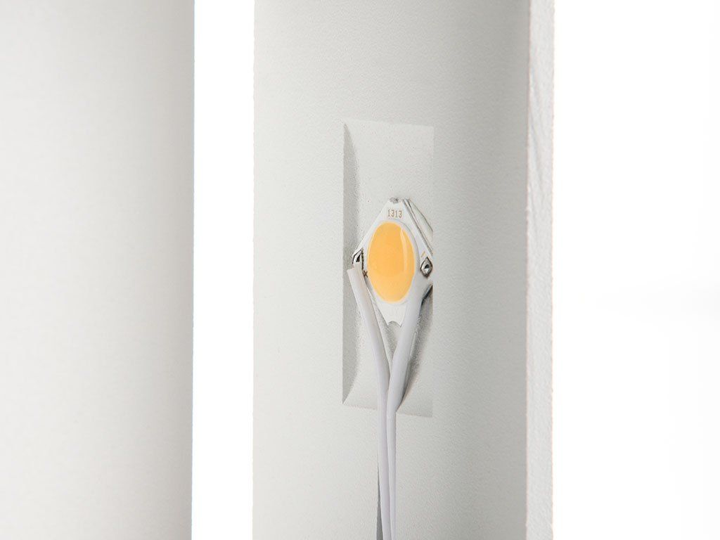 Svítidlo LED2 WALL Q vydává 400 lm při příkonu 6 W a vytváří symetrické světelné kříže nad i pod svítidlem díky úhlu 2 × 160°. Kubické tělo o rozměrech 100 × 100 × 60 mm je odlito z hliníku (ALUMINIUM/PMMA) a opatřeno matným bílým lakem RAL 9016. Zlatavý vnitřní reflektor optické komory tvoří výrazný vizuální kontrast – detail, který ocení každý, kdo hledá nástěnnou lampu s charakterem. Barevná teplota 3 000 K navodí teplou, pohostinnou atmosféru v obývacím pokoji, chodbě, hotelovém lobby nebo restauraci. Svítidlo splňuje krytí IP 20, je tedy určeno pro suchý interiér. Efektivita 67 lm/W a životnost 30 000 h (L80 B20) zaručují nízké provozní náklady po celou dobu provozu. Napájení 220–240 V AC, 50–60 Hz umožňuje přímé zapojení do standardní sítě.